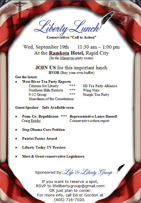 National News A Conservative Call To Action by Gordon Howie • September 17, 2012 • 0 Comments Don’t Miss The Liberty Lunch Join Conservative Legislators, Tea Party leaders, Patriot Pastors and others at the Liberty Lunch. This Wed., September 19th at 11:30 Share this:FacebookX