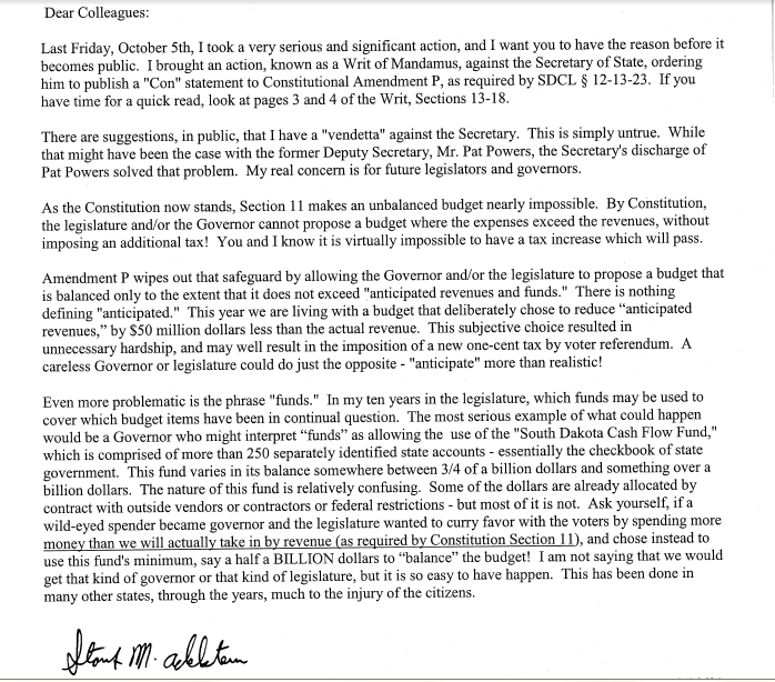 Senator Adelstein says this is not a “vendetta” against the Secretary. He sent this letter to members of the House and Senate, explaining his position.