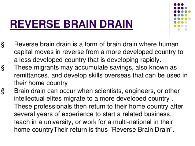 Woe to the small American towns and Third world countries around the globe that need their “scientists, engineers, or other intellectual elites” (see below) to stay home and nourish entrepreneurialism from within. Instead, we end up with a global homogeneity that is bought at the expense of cultural identity. Roots, family, and heritage count for nothing in our modern greed-based world. The few examples of reverse brain drain become pure media hype.