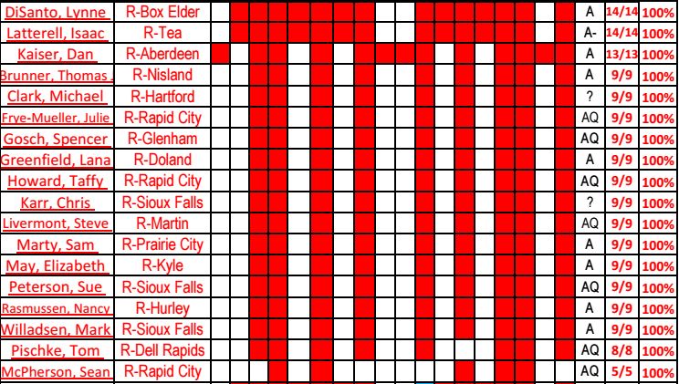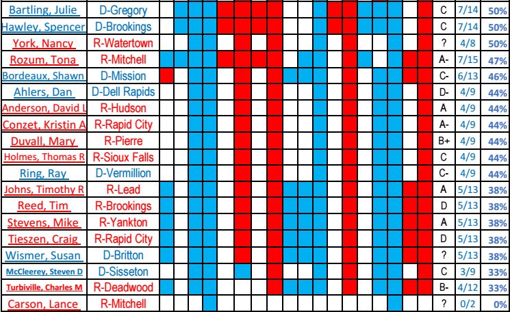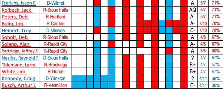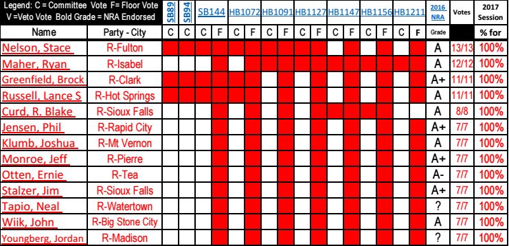 South Dakota Citizens for Liberty has followed the voting records of current Legislators, and given them a percentage rating. They have included the NRA rating in their report, but with the caution that the NRA rating may not be a clear indicator, since it does not take into account all the votes both in and out of committee.