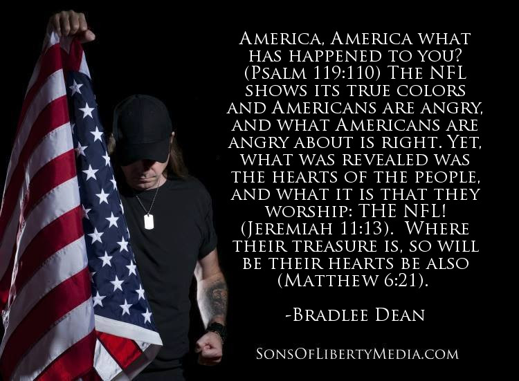 In politics, nothing happens by accident. If it happens, you can bet it was planned that way. –President Franklin D. Roosevelt America, America what has happened to you? (Psalm 119:110) The NFL shows its true colors and Americans are angry, and what Americans are angry about is right. Yet, what was revealed was the hearts of the people, and what it is that they worship: THE NFL! (Jeremiah 11:13). Where their treasure is, so will be their hearts be also (Matthew 6:21). Grown up men with tights on fighting over a pig ball. How shameful! Babies being slaughtered in the womb, sodomy, indoctrination of America’s posterity etc… Where is the uproar? The hypocrisy stinks to high heaven (Matthew 23). I was George Orwell who said, “Football and Beer….filled the horizon of their minds. To keep them in control was not difficult!” How true that statement is. Can you imagine a people that still feared the Lord (Proverbs 16:6) and were indignant when it came to correcting corruption in the Church and in the government?