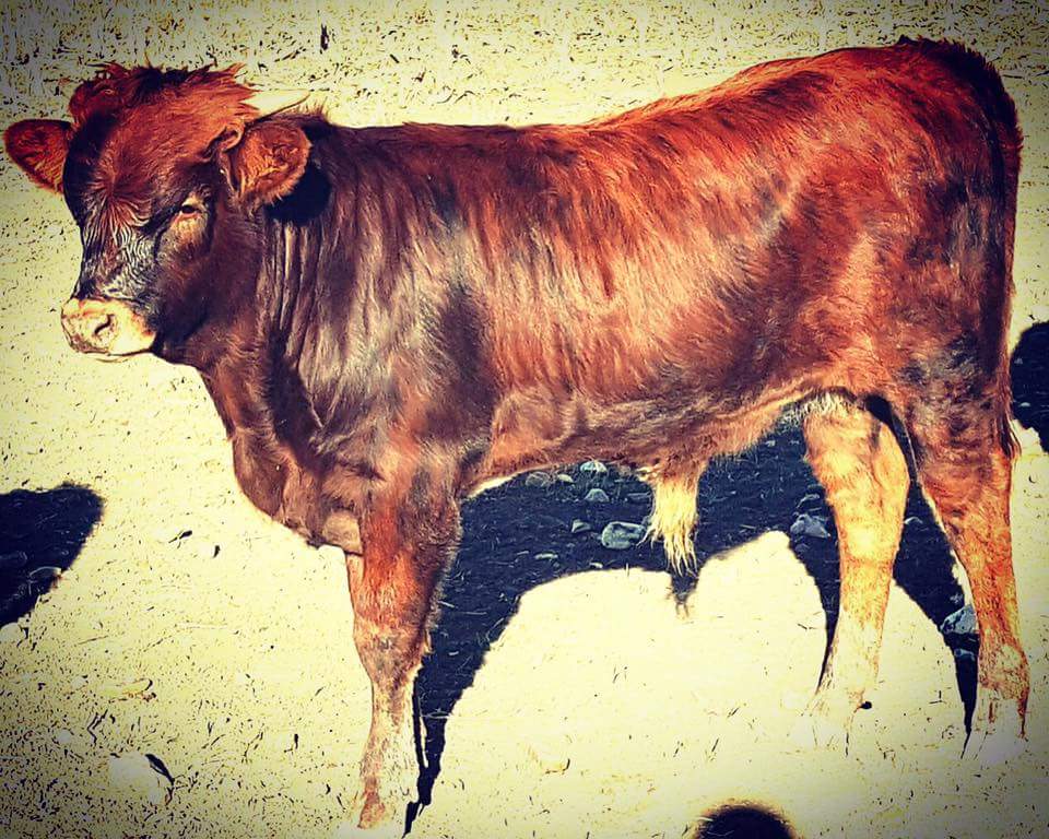 One of my favorite 2017 Top Hand bull calves comes from a solid red cow. His horn and conformation are excellent, but the best part is his color. He is developing into an absolutely striking brindle. I have also had great results from my red cows by using a son of Drag Iron.