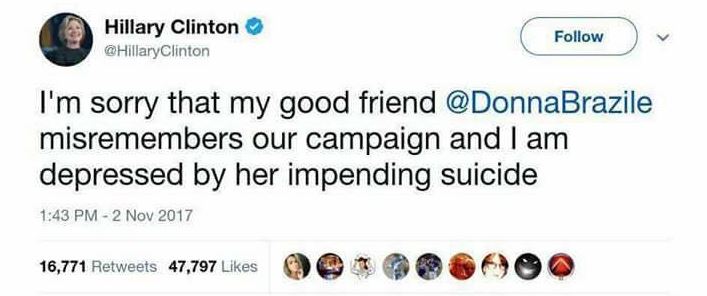 Editors note: For the benefit of those who may not quickly grasp it, the ‘twitter from Hillary’ is not really from Hillary. It is from someone with a sense of humor. To more fully understand this attempt at humor, readers who are not amused might be interested in some background reading. Here is a list of 90 deaths which have some connection to the Clintons.