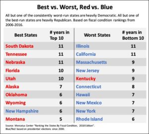 “Which political party is better at managing taxpayer dollars? The latest ranking of states’ fiscal condition offers an unequivocal answer,” reports IBD in “What Do The Worst-Run States Have In Common? They’re Run By Tax-And-Spend Democrats.” South Dakota is on top. Neighboring Wyoming, Nebraska, and Montana are also in the Top 10 in terms of the “five measures of their financial condition: cash solvency, budget solvency, the ability to meet long-term spending commitments, state spending and taxes as a share of personal income, and unfunded pension liabilities and debt.”