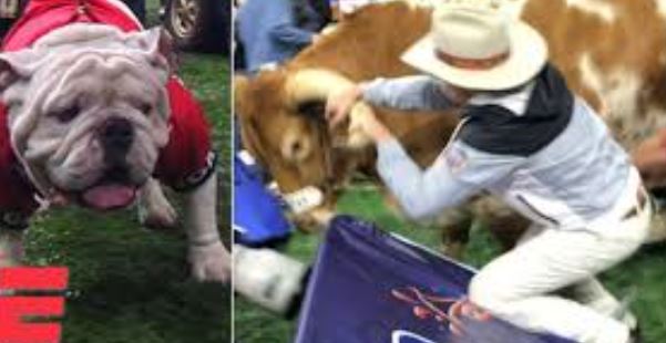 The Longhorn Steer, Bevo, who is the gentle mascot for the Texas Longhorn football team was “introduced” to the Georgia mascot, Uga, a bulldog. The result was not what the handlers anticipated.
