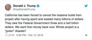 The federal government might well be getting more wall funding from unstable business environments like California, which recently cancelled a bullet train project between Los Angeles and San Francisco.