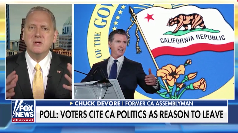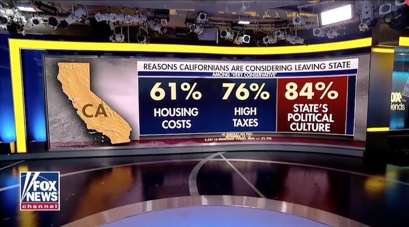The traffic out of California should be instructive. Former California politician Chuck DeVore, another policy analyst, cites a Berkeley poll that “A full 74 percent of the state’s very conservative voters say they’re looking into moving, and 84 percent of those cite California’s political culture as their rationale for leaving.” Cost of living is way out of proportion to the rest of the country except in other deep-left states. FoxNews has picked this up today in an interview with DeVore.