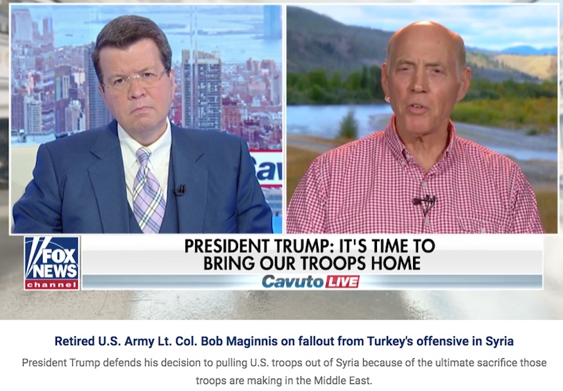 Yes, the Kurds have been allies against ISIS, says Maginnis, but in pursuit of their own interests, not ours directly: “The Kurds were engaged in a contractual relationship fighting the Islamic State (ISIS). They were well paid and equipped for their fighting, much like any mercenary group. Further, they were given three years to consolidate eastern Syria to feed their long-held desire to form an independent Kurdistan with other Kurds in Turkey, Iraq, and Iran. They failed.” FoxNews has also interviewed Maginnis online (banner above).
