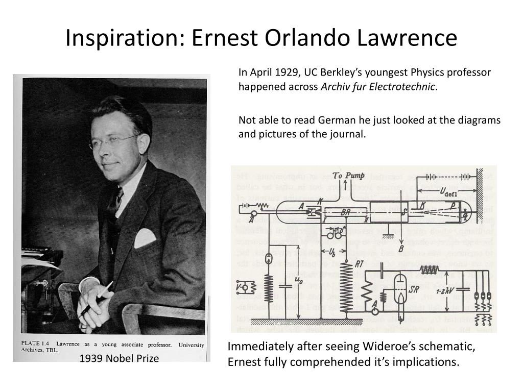He got some of his ideas the way prominent scientists like Michael Faraday had always done, by making concept models with materials around his home. He got ideas about particle acceleration by watching children swinging on the playground. He spent lots of time in the university library picking up ideas from other experts, like Norwegian physicist Rolf Widerøe (above), just by studying a schematic diagram in a journal.