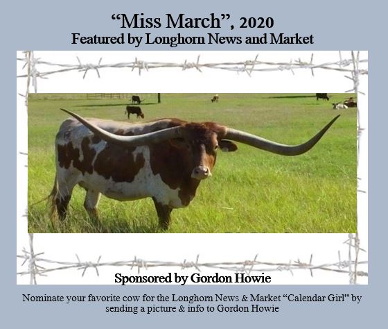“Miss March”, 2020 featured by Longhorn News and Market. The legendary BL Rio Catchit, DOB 9/7/2006. 100.375” TTT She isn’t just one of only seven Longhorn cows to reach the 100” mark, she is the dam of the ONLY Longhorn bull to be there as well (103.375”TTT). She is owned by Bob and Pam Loomis http://www.loomisranchlonghorns.com/Default.aspx?AnimalID=29177&Name=BLRIOCATCHIT