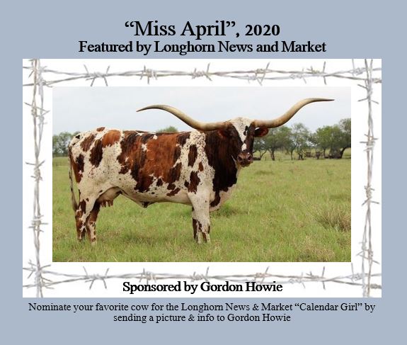 ”Miss April”, 2020 featured by Longhorn News and Market. Red River Sedona DOB 7/17/2010. 86.125” TTT A beautiful and ‘complete package” Longhorn Cow Owned by Singing Coyote Ranch http://singingcoyoteranch.com/1161/