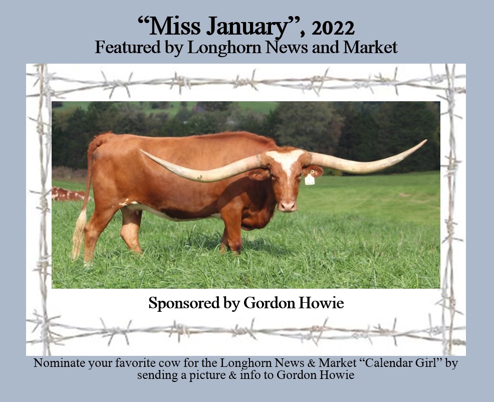 “Miss January”, 2022 featured by Longhorn News and Market. WPR Knock Your Socks Off has 94.375” of gracefully sweeping tip-to-tip horn. She is owned by the Davidson/Gravett Partnership. http://www.gandgtexaslonghorns.com/Default.aspx?AnimalID=79724&Name=WPRKnockYourSocksOff