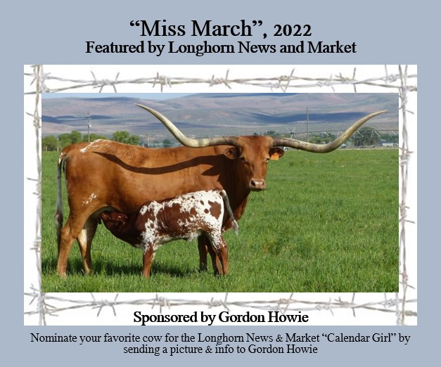 “Miss March”, 2022 featured by Longhorn News and Market. JP Grand Tulip is 96” tip-to-tip with over 117” of total horn. She is owned by Alexandra Dees, CR Longhorns http://www.crlonghorns.com/Default.aspx?AnimalID=26095&Name=JPGRANDTULIP